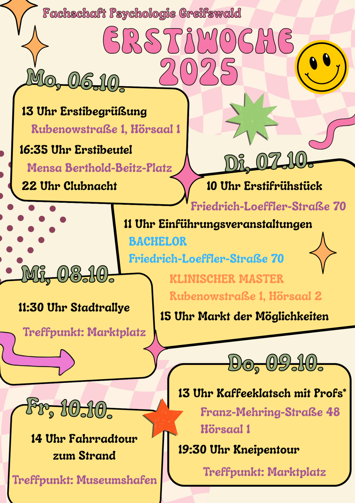Ihr beginnt in diesem Winter euer Psychologiestudium in Greifswald? Dann solltet Ihr euch unbedingt über das Programm der diesjährigen Ersti-Woche informieren. Wir haben ein extra Programm für euch Psychos zusammengestellt, das Ihr hier könnt. Wir freuen uns auf Euch!